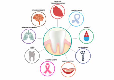 La bocca è lo specchio del corpo: quasi tutte le malattie del corpo hanno effetti nella bocca: se si  hanno problemi di Fegato si alterano i fattori della coagulazione, si possono avere macchie rosse  (Petecchie), o difficoltà a fermare il sangue dopo un’estrazione di un dente.  Chi soffre di Osteoporosi o ha avuto un tumore al seno o un tumore alla prostata viene spesso  trattato con farmaci che agiscono sulle ossa (Bifosfonati, Denosumab, alcuni farmaci “biologici” o “target”); questi farmaci sono molto efficaci, ma causano problemi enormi ed invalidanti nelle mascelle.